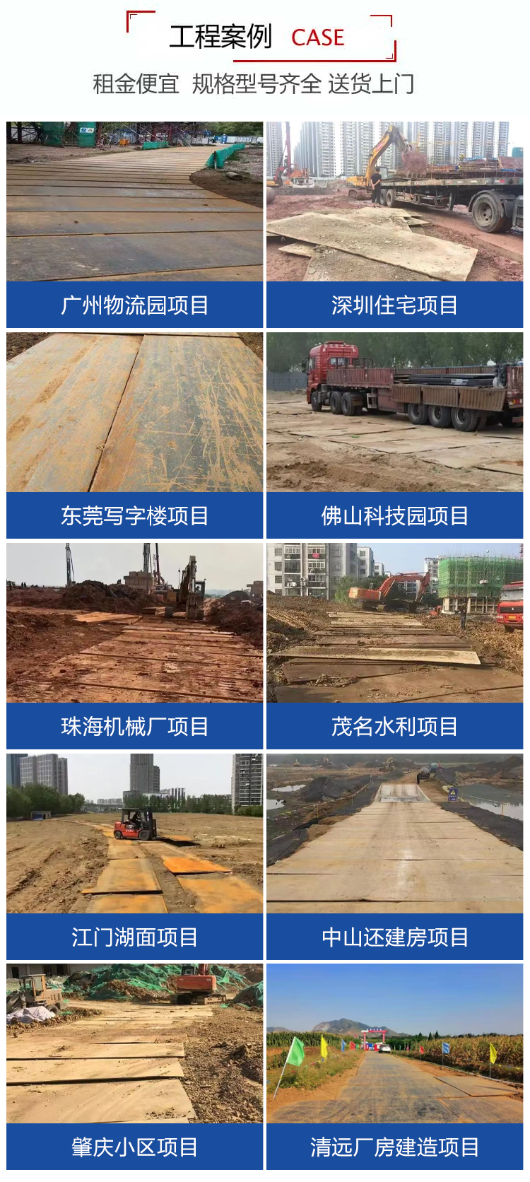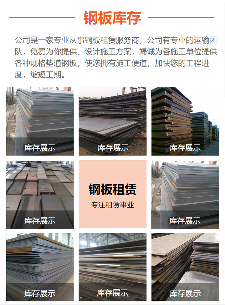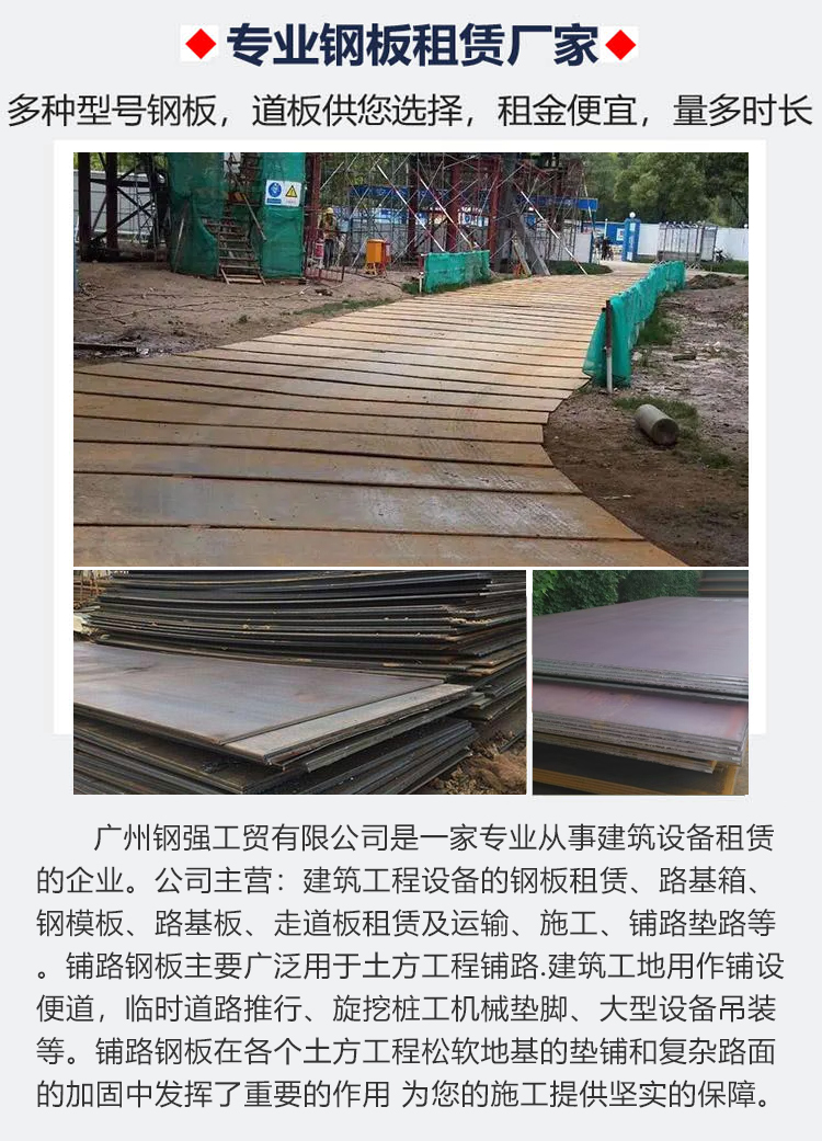 廣州鋼強工貿有限公司是一家專業(yè)從事建筑設備租賃的企業(yè)。公司主營:建筑工程設備的鋼板租賃、路基箱、鋼模板、路基板、走道板租賃及運輸、施工、鋪路墊路等。鋪路鋼板主要廣泛用于土方工程鋪路.建筑工地用作鋪設便道,臨時道路推行、旋挖樁工機械墊腳、大型設備吊裝等。鋪路鋼板在各個土方工程松軟地基的墊鋪和復雜路面的加固中發(fā)揮了重要的作用 為您的施工提供堅實的保障鋼板租賃是一種可以十分有效節(jié)約資金的方式,在市場上通過租賃鋼板完成工程的施工企業(yè)越來越多。這種方式受到了眾多企業(yè)的歡迎,可以看出鋼板租賃的市場前景一片光明。鋼板租賃只需要付出鋼板的租賃費用就可以了,這對于資金緊缺的企業(yè)來講是很方便的,畢竟購買同樣數(shù)量的鋼板的價格是需要更多的資金的,如果一開始就在鋼板的問題上花費了大量的經費,在工程后期很有可能出現(xiàn)資金···